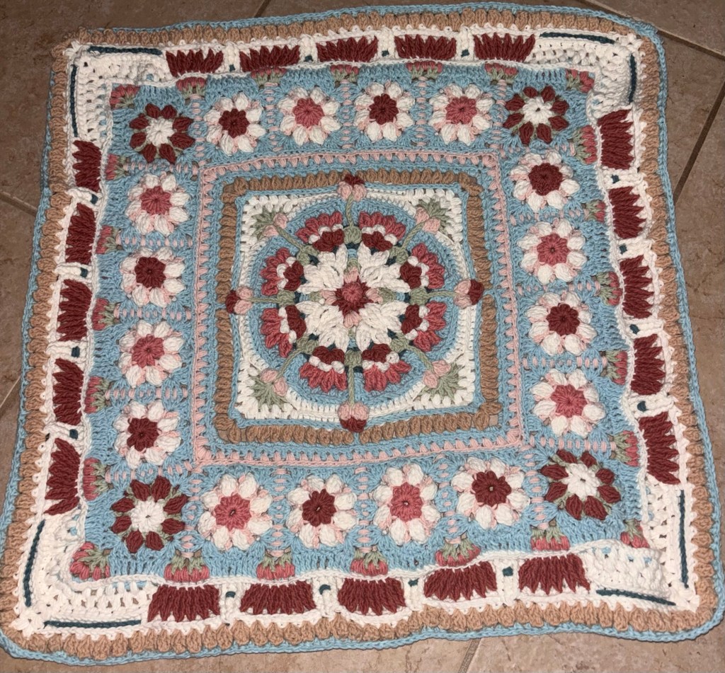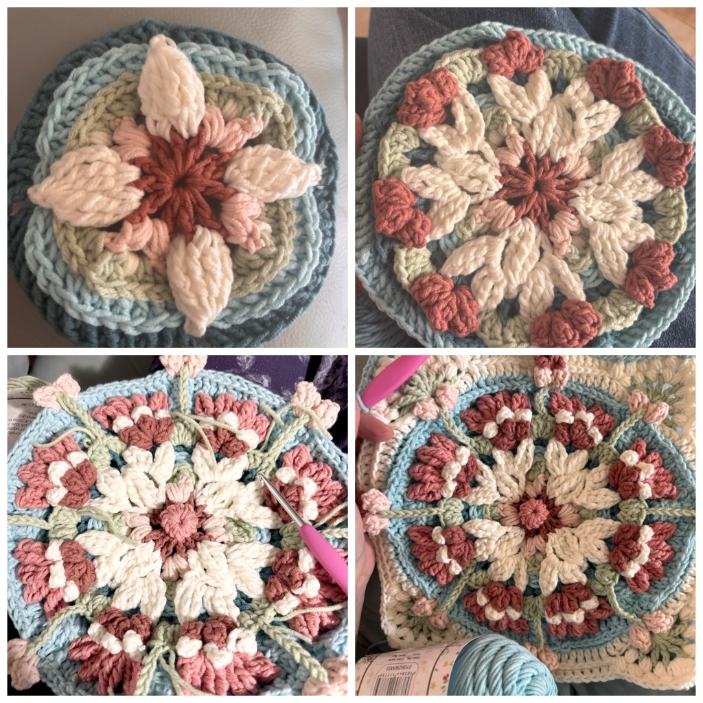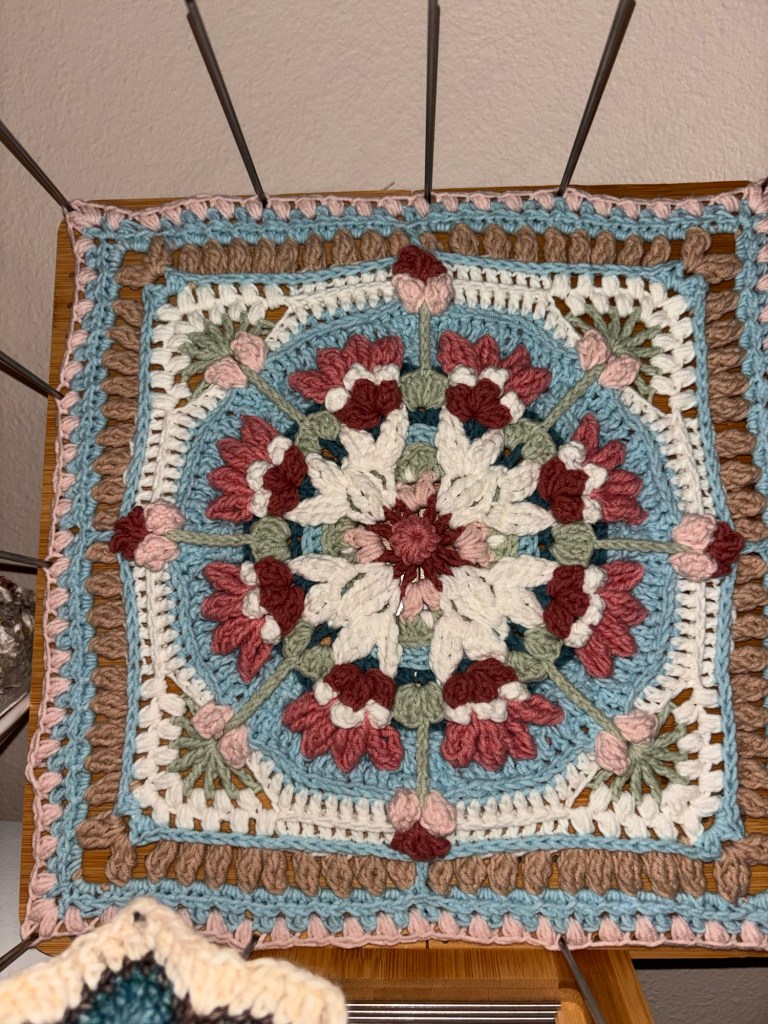 Currently I am working on the Harvest Moon Blanket (block and extension) by Hooks n Tales. I have chosen to choose my own colors and am using a yarn that I have not used before: Herrschners Cottage Cotton. I am finding it lovely to work with. I am using the colors: Oceanside, Tame Teal, Silver Sage, Posy, Pale Oak, Blossom, and Cherry Glow, all with a 3.5mm Clover hook.