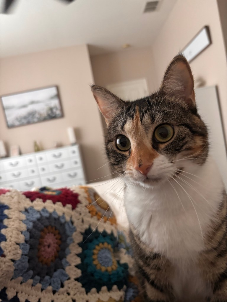 This week I learned that my sweet napping buddy, Beans, may have alternative motives to nap times. I woke to find her intently looking at me, as if waiting on something that I just could not understand. I rose and went after a drink and when I came back around to the room, I found her all cozy in my favorite afghan. So now I wonder, is it me she likes to nap with or is she really just there for the cozy blankets and she secretly wants me out of the way? I also think she may just be looking for photo ops??